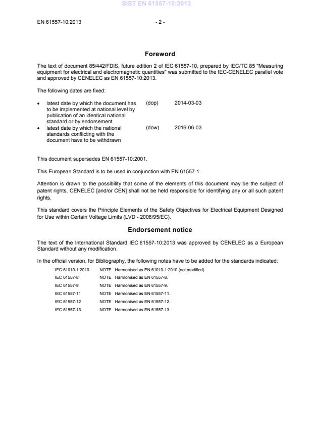This document supersedes EN 61557-10:2001. This European Standard is to be used in conjunction with EN 61557-1. Attention is drawn to the possibility that some of the elements of this document may be the subject of patent rights. CENELEC [and/or CEN] shall not be held responsible for identifying any or all such patent rights. This standard covers the Principle Elements of the Safety Objectives for Electrical Equipment Designed for Use within Certain Voltage Limits (LVD - 2006/95/EC). Endorsement notice The text of the International Standard IEC 61557-10:2013 was approved by CENELEC as a European Standard without any modification. In the official version, for Bibliography, the following notes have to be added for the standards indicated: IEC 61010-1:2010 NOTE
