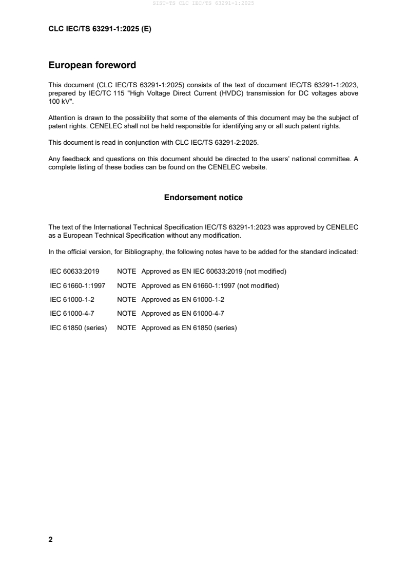 CLC IEC/TS 63291-1:2025 is a technical specification (adoption of IEC/TS 63291-1) that provides a guideline for planning, specification and execution of multi‑vendor HVDC grid systems (commonly called HVDC grids). It applies to high‑voltage DC systems where more than two HVDC stations share a common DC circuit - radial, meshed or hybrid topologies - and is targeted at high‑voltage transmission applications (nominal DC voltages typically higher than 50 kV; prepared by IEC/TC 115 for DC voltages above 100 kV). The document focuses on functional specifications for HVDC grids and connected AC/DC converter stations, while flagging DC/DC converter stations as proposed future work.