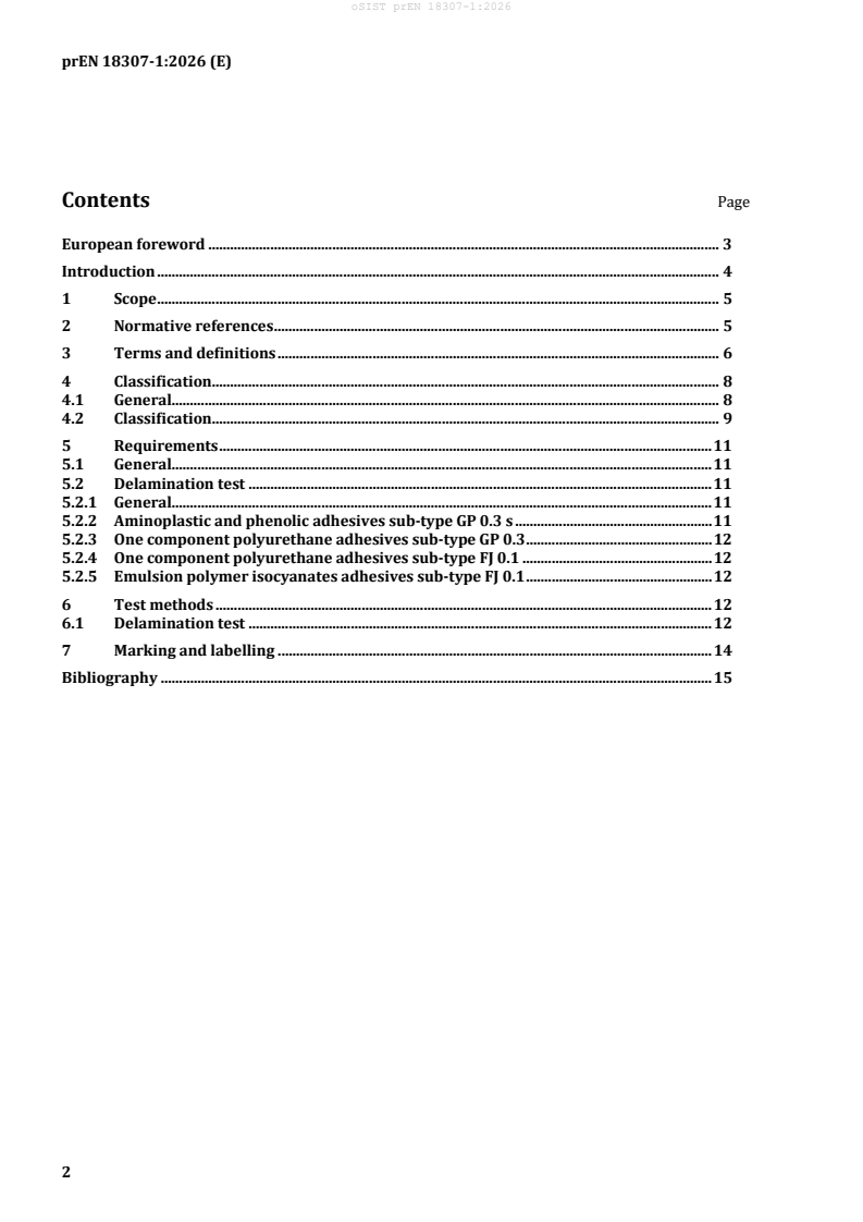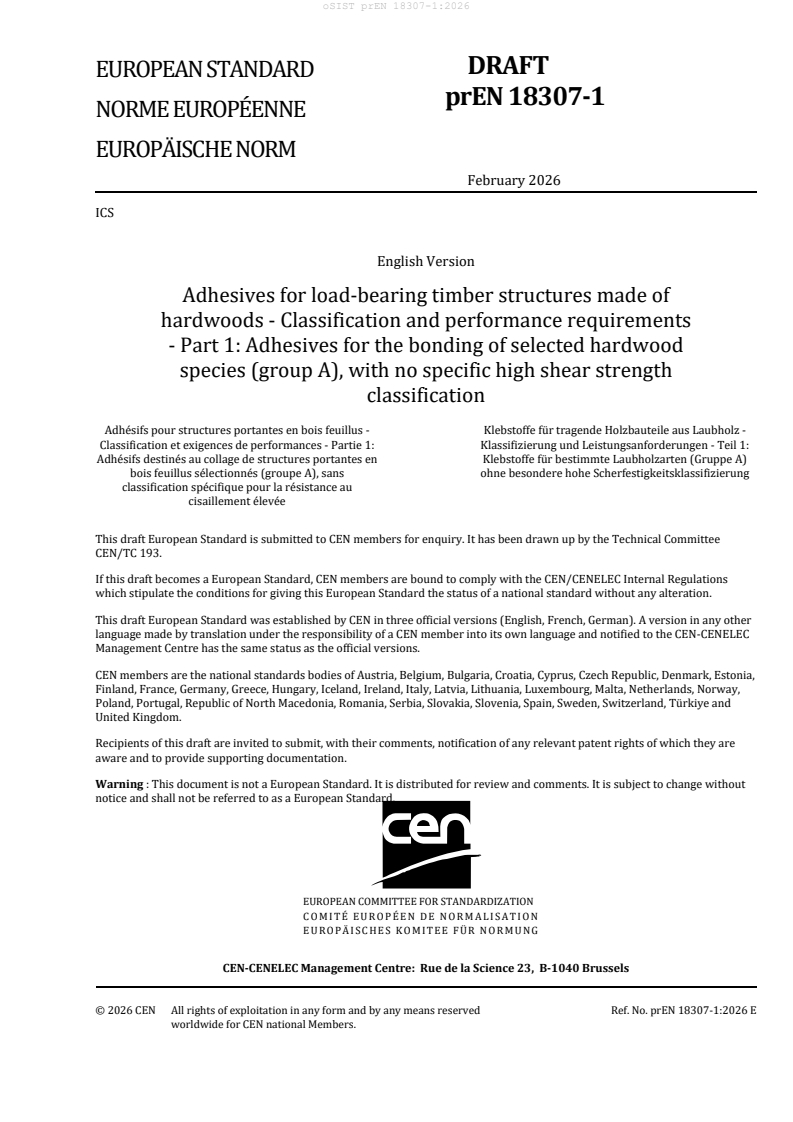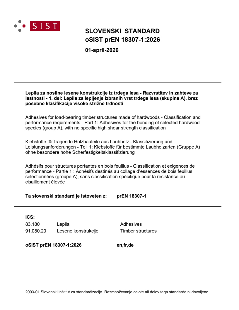 oSIST prEN 18307-1:2026 is a draft European Standard developed by CEN (European Committee for Standardization). It focuses on the classification and performance requirements of adhesives used for load-bearing timber structures made from selected hardwood species (group A), without a specific high shear strength classification. The document covers various types of adhesives, including phenolic and aminoplastic polycondensation adhesives (as per EN 301), one component polyurethane adhesives (as per EN 15425), and emulsion polymer isocyanate adhesives (as per EN 16254). This standard is particularly relevant for adhesive manufacturers and professionals involved in the production and assessment of factory-manufactured hardwood timber structures.