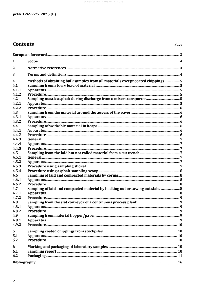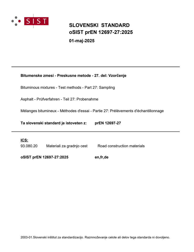 Keywords: prEN 12697-27, sampling bituminous mixtures, CEN, road construction materials, bulk sample, sampling procedures, asphalt sampling, mastic asphalt, paver sampling, coated chippings, laboratory sample.