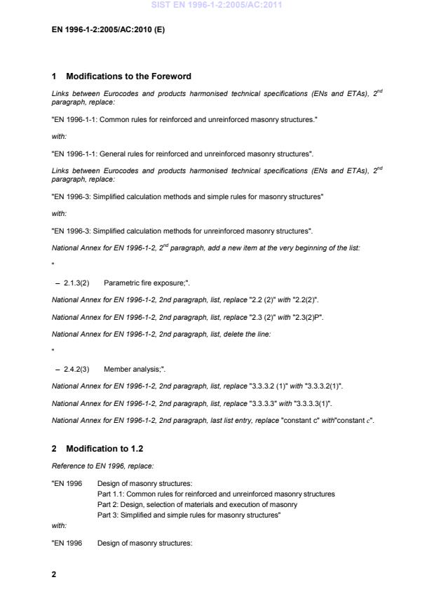 Member analysis;". National Annex for EN 1996-1-2, 2nd paragraph, list, replace "3.3.3.2 (1)" with "3.3.3.2(1)". National Annex for EN 1996-1-2, 2nd paragraph, list, replace "3.3.3.3" with "3.3.3.3(1)". National Annex for EN 1996-1-2, 2nd paragraph, last list entry, replace "constant c" with"constant c". 2 Modification to 1.2 Reference to EN 1996, replace: "EN 1996 Design of masonry structures: