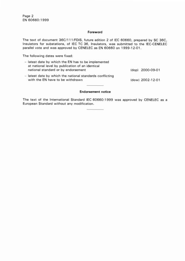 EN 60660:1999 (CLC adoption of IEC 60660:1999) is a testing standard for indoor post insulators of organic material used on alternating-current systems with nominal voltages greater than 1 kV and less than 300 kV. The standard defines terminology, prescribes electrical and mechanical characteristics, and sets out test methods and acceptance criteria for indoor service in air at atmospheric pressure (frequency ≤ 100 Hz). Composite insulators are explicitly excluded. EN 60660:1999 does not give numerical values for characteristics or select insulators for specific service conditions - numerical values and interchangeability dimensions are provided by related documents (for example HD 578 S1 / IEC 60273).