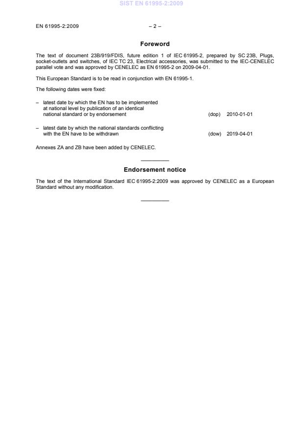 (dow) 2019-04-01 Annexes ZA and ZB have been added by CENELEC. __________ Endorsement notice The text of the International Standard IEC 61995-2:2009 was approved by CENELEC as a European Standard without any modification. __________ SIST EN 61995-2:2009