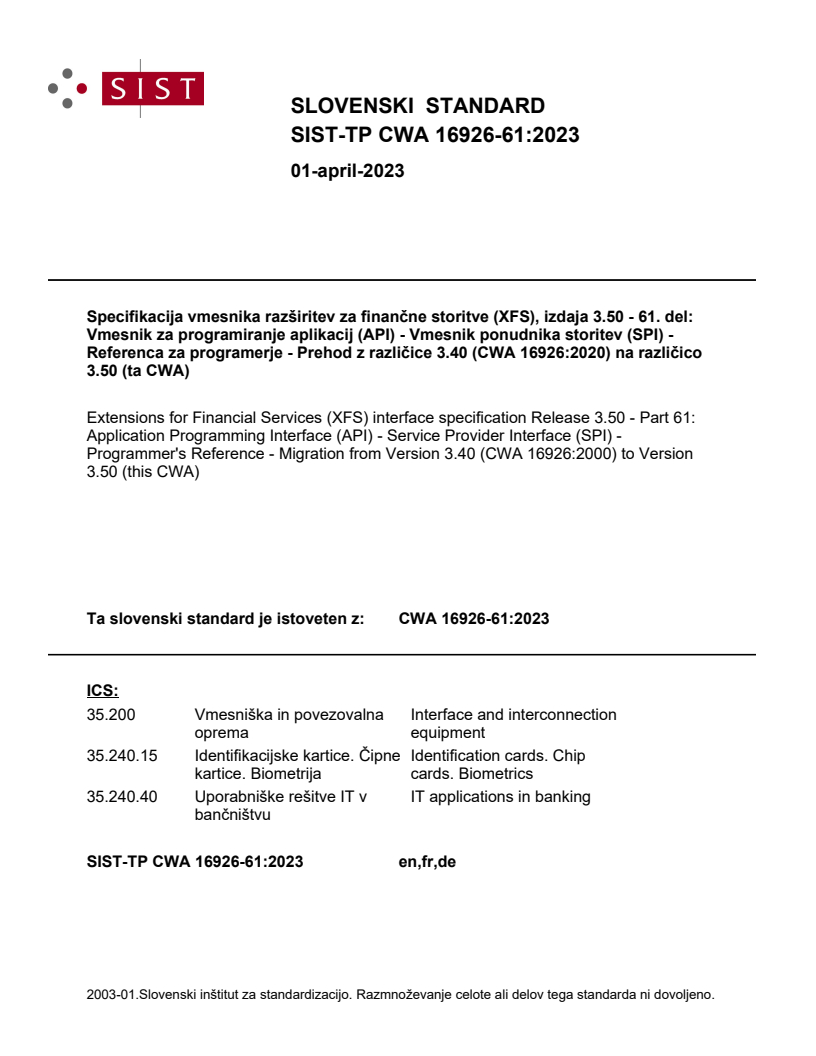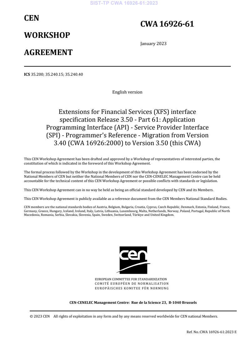 SIST-TP CWA 16926-61:2023 is a technical report published by the Slovenian Institute for Standardization (SIST). Its full title is "Extensions for Financial Services (XFS) interface specification Release 3.50 - Part 61: Application Programming Interface (API) - Service Provider Interface (SPI) - Programmer's Reference - Migration from Version 3.40 (CWA 16926:2000) to Version 3.50 (this CWA)". This standard covers: This specification shows the modifications made to version 3.40 of CWA 16926-1 in version 3.50.