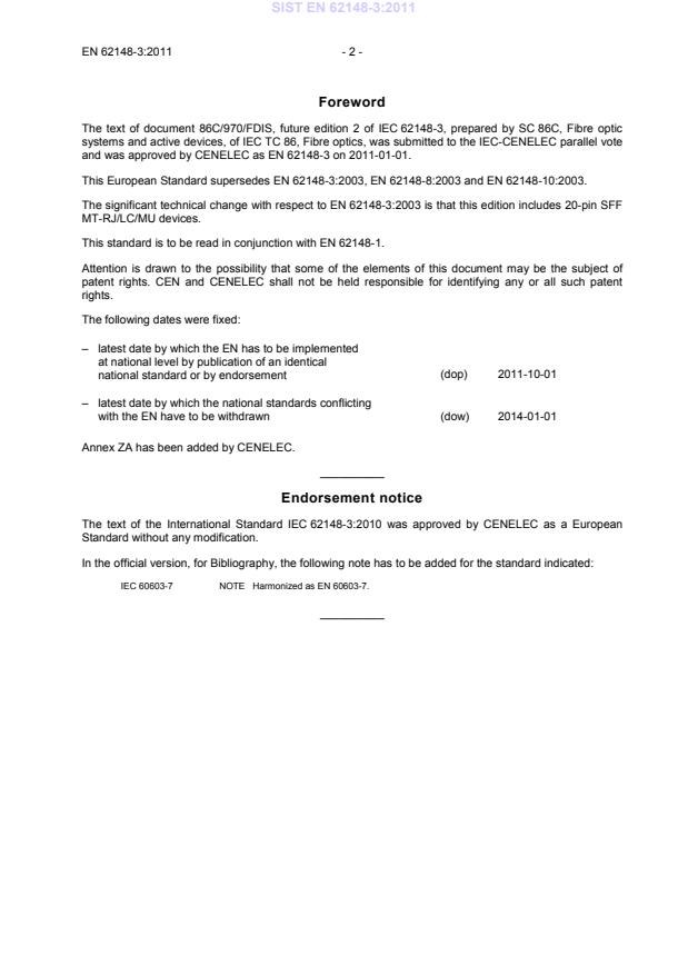 2014-01-01 Annex ZA has been added by CENELEC. __________ Endorsement notice The text of the International Standard IEC 62148-3:2010 was approved by CENELEC as a European Standard without any modification. In the official version, for Bibliography, the following note has to be added for the standard indicated: IEC 60603-7 NOTE