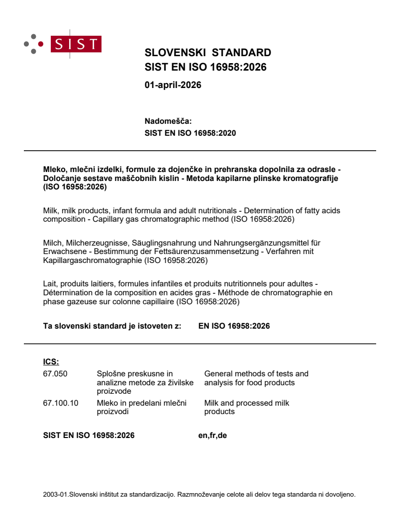 SIST EN ISO 16958:2026 is a standard published by the Slovenian Institute for Standardization (SIST). Its full title is "Milk, milk products, infant formula and adult nutritionals - Determination of fatty acids composition - Capillary gas chromatographic method (ISO 16958:2026)". This standard covers: This document specifies a method for the quantification of individual and/or all fatty acids content in the profile of milk, milk products, infant formula and adult nutritional formula, containing milk fat and/or vegetable oils, supplemented or not supplemented with oils rich in long chain polyunsaturated fatty acids (LC-PUFA). This also includes groups of fatty acids often labelled [i.e. trans fatty acids (TFA), saturated fatty acids (SFA), monounsaturated fatty acids (MUFA), polyunsaturated fatty acids (PUFA), omega-3, omega-6 and omega-9 fatty acids] and/or individual fatty acids [i.e. linoleic acid (LA), α-linolenic acid (ALA), arachidonic acid (ARA), eicosapentaenoic acid (EPA) and docosahexaenoic acid (DHA)]. The determination is performed by direct transesterification in food matrices, without prior fat extraction, and consequently it is applicable to liquid samples or reconstituted powder samples with water having total fat ≥ 1,5 % (mass fraction). The fat extracted from products containing less than 1,5 % (mass fraction) fat can be analysed with the same method after a preliminary fat extraction using methods referenced in Clause 2. Dairy products, such as soft or hard cheeses with acidity level ≤ 1 mmol/100 g of fat, can be analysed after a preliminary fat extraction using methods referenced in Clause 2. For products supplemented or enriched with PUFA with fish oil or algae origins, the evaporation of solvents is performed at the lowest possible temperature (e.g. max. 40 °C) to recover these sensitive fatty acids.