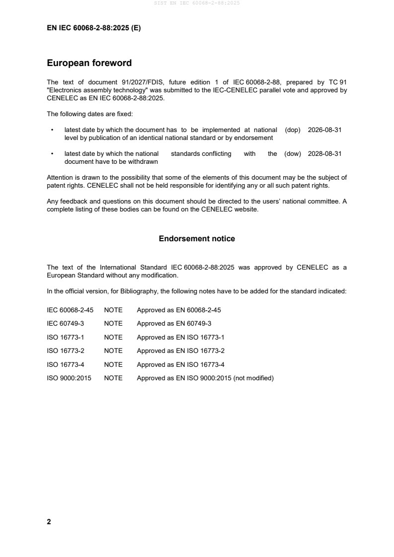 EN IEC 60068‑2‑88 references other environmental and solderability standards (e.g., IEC 60068‑2‑20, IEC 60068‑2‑58) and aligns with common process and test requirements for electronics cleaning and soldering validation.