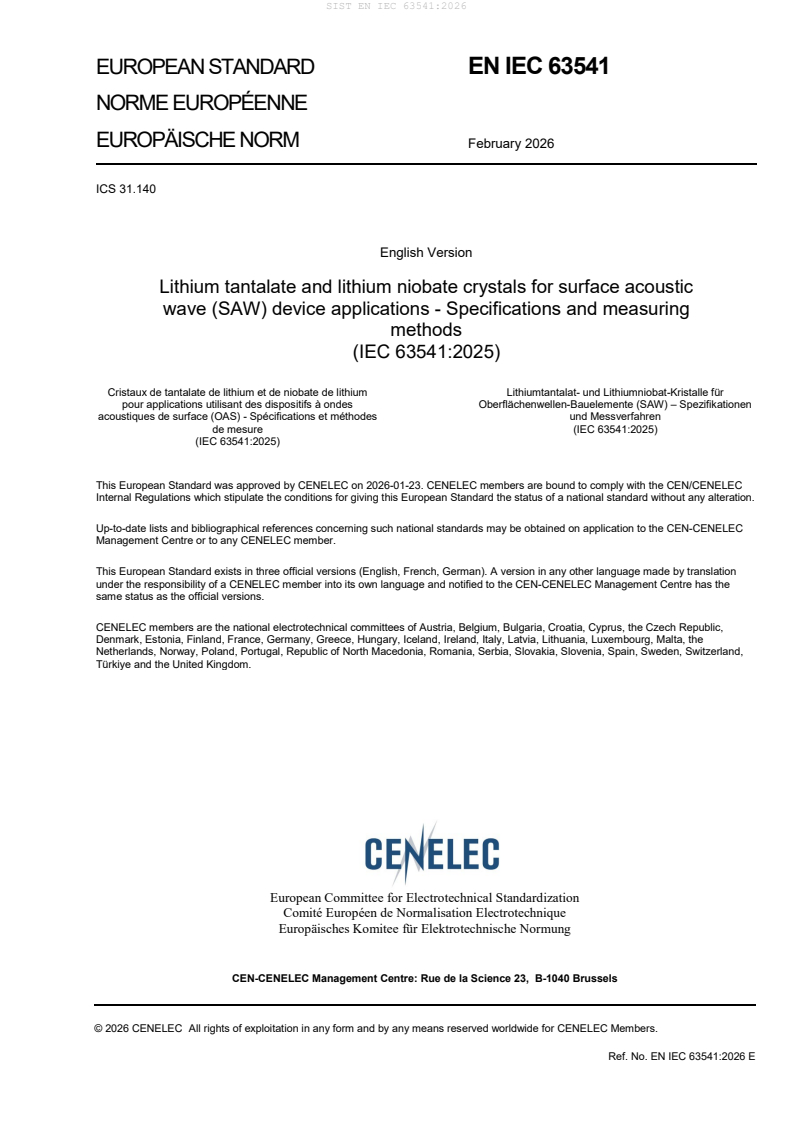 SIST EN IEC 63541:2026 is a standard published by the Slovenian Institute for Standardization (SIST). Its full title is "Lithium tantalate and lithium niobate crystals for surface acoustic wave (SAW) device applications - Specifications and measuring methods (IEC 63541:2025)". This standard covers: IEC 63541:2025 applies to lithium tantalate (LT) and lithium niobate (LN) crystals for surface acoustic wave devices, including the as-grown crystals and lumbered crystals.
