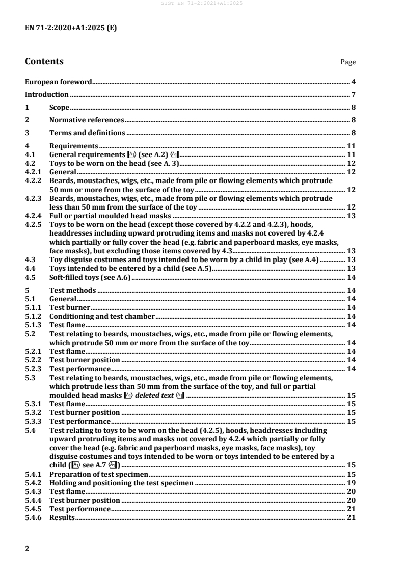 SIST EN 71-2:2021+A1:2025 is a standard published by the Slovenian Institute for Standardization (SIST). Its full title is "Safety of toys - Part 2: Flammability". This standard covers: This European Standard specifies the categories of flammable materials which are prohibited in all toys, and requirements concerning flammability of certain toys when they are subjected to a small source of ignition. The test methods described in Clause 5 are used for the purposes of determining the flammability of toys under the particular test conditions specified. The test results thus obtained cannot be considered as providing an overall indication of the potential fire hazard of toys or materials when subjected to other sources of ignition. This European Standard includes general requirements relating to all toys and specific requirements and methods of test relating to the following toys, which are considered as being those presenting the greatest hazard: - toys to be worn on the head: beards, moustaches, wigs, etc. made from hair, pile or material with similar features; masks; hoods, head-dresses, etc.; flowing elements of toys to be worn on the head, but excluding paper novelty hats of the type usually supplied in party crackers; - toy disguise costumes and toys intended to be worn by a child in play; - toys intended to be entered by a child; - soft-filled toys. NOTE Additional requirements for flammability of electric toys are specified in EN IEC 62115.