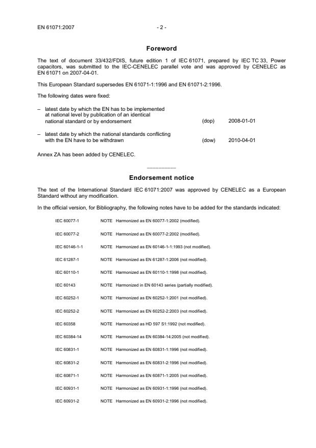 EN 61071:2007 references numerous harmonized IEC/EN documents relevant to environmental testing, insulation coordination and safety, for example IEC/EN 60068-2 (environmental tests), IEC/EN 60664-1 (insulation coordination) and other capacitor and switchgear standards cited in Annex ZA.