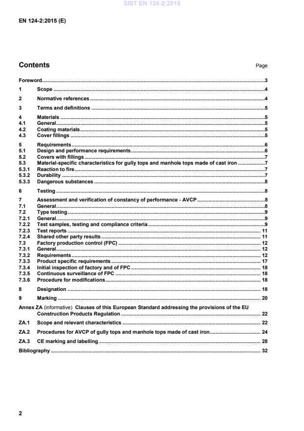 Clauses of this European Standard addressing the provisions of the EU Construction Products Regulation . 22 ZA.1 Scope and relevant characteristics . 22 ZA.2 Procedures for AVCP of gully tops and manhole tops made of cast iron . 24 ZA.3 CE marking and labelling . 28 Bibliography . 32