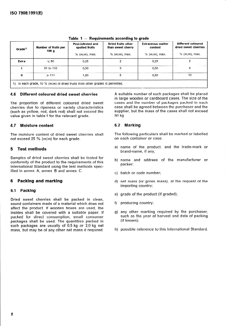 Keywords: ISO 7908, dried sweet cherries, Prunus avium, dried fruit standards, grading, moisture content, pest infestation, spoilage, food packaging, quality testing, international standard, food safety, agricultural products.