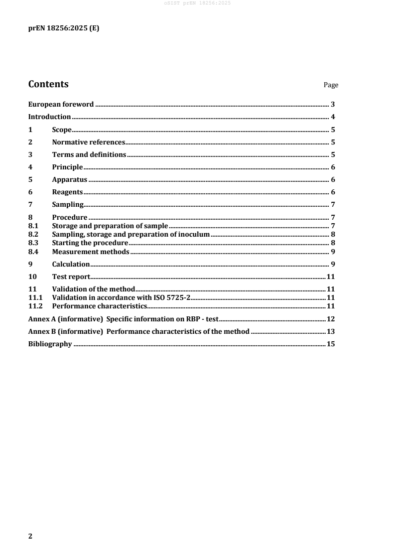 The oSIST prEN 18256:2025:2025 standard, developed by the European Committee for Standardization (CEN), specifies a standardized method to determine the Residual Biogas Potential (RBP) in digestate within an anaerobic environment. Digestate, a byproduct of anaerobic digestion, contains organic material that may continue to generate biogas if unstable. This test is fundamental for assessing the stability of digestate, ensuring efficient biogas plant operation and reliable application of digestate as a soil improver or fertilizer.