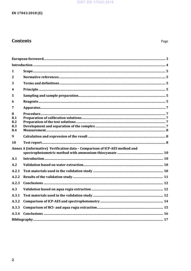Verification data – Comparison of ICP-AES method and spectrophotometric method with ammonium thiocyanate . 10 A.1 Introduction . 10 A.2 Validation based on water extraction. 10 A.2.1 Test materials used in the validation study . 10 A.2.2 Results of the validation study . 11 A.2.3 Conclusions . 12 A.3 Validation based on aqua regia extraction . 12 A.3.1 Test materials used in the validation study . 12 A.3.2 Comparison of ICP-AES and spectrophotometry . 14 A.3.3 Comparison of HCl- and aqua regia extraction . 15 A.3.4 Conclusions . 16 Bibliography . 17