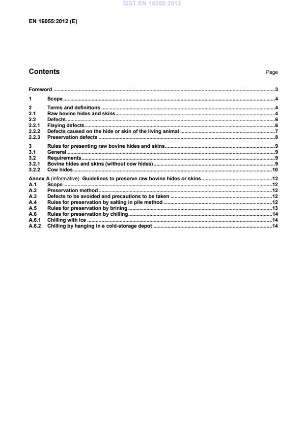 Guidelines to preserve raw bovine hides or skins . 12A.1 Scope . 12A.2 Preservation method . 12A.3 Defects to be avoided and precautions to be taken . 12A.4 Rules for preservation by salting in pile method . 12A.5 Rules for preservation by brining . 13A.6 Rules for preservation by chilling . 14A.6.1 Chilling with ice . 14A.6.2 Chilling by hanging in a cold-storage depot . 14 SIST EN 16055:2012