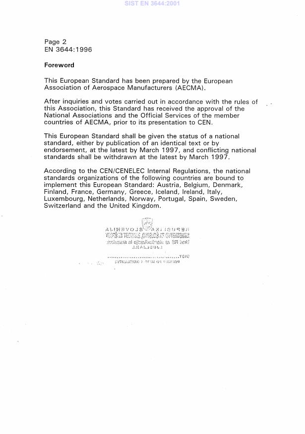 - Conformance designation: the standard is published as EN 3644:1996 and is incorporated nationally as SIST EN 3644:2001 (Slovenia).