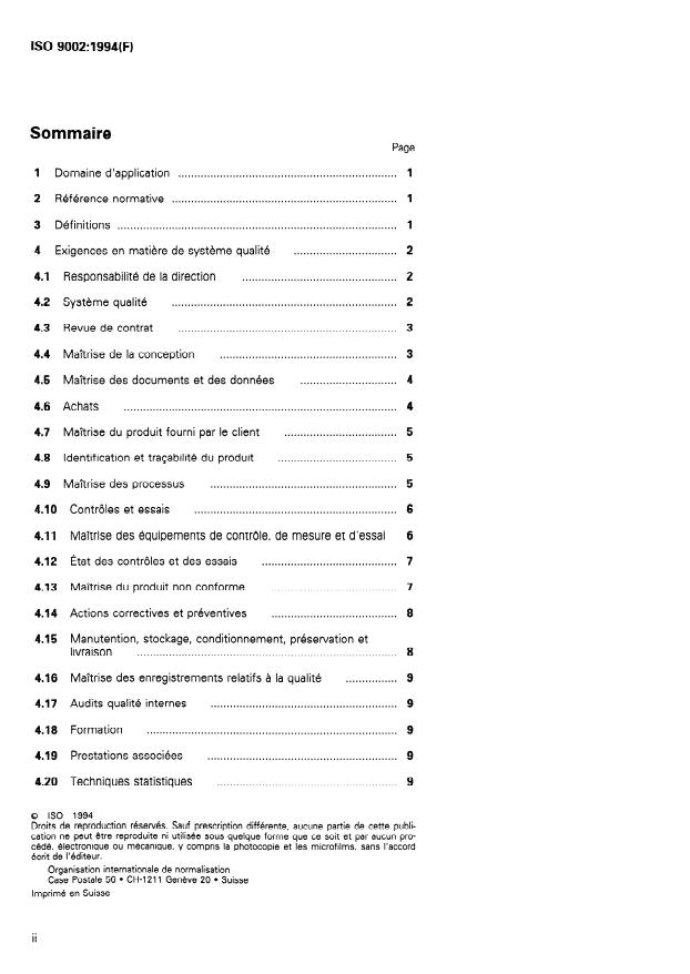 SIST ISO 9002:1995 is a standard published by the Slovenian Institute for Standardization (SIST). Its full title is "Quality systems -- Model for quality assurance in production, installation and servicing". This standard covers: La présente Norme internationale spécifie des exigences en matière de système qualité à utiliser lorsque l'aptitude d'un fournisseur à fournir un produit conforme à une conception établie doit être démontrée. Les exigences spécifiées visent en premier lieu la satisfaction du client, par la prévention des non-conformités à tous les stades, depuis la production jusqu'aux prestations associées. La présente Norme internationale est applicable lorsque a) les exigences spécifiées pour le produit sont formulées en termes de conception ou de spécification établie, et b) la confiance dans la conformité du produit peut être obtenue par une démonstration adéquate des aptitudes d'un fournisseur en matière de production, installation et prestations associées. NOTE 1 Pour les références informatives, voir annexe A.