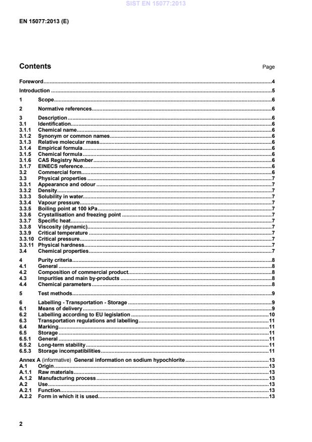 General information on sodium hypochlorite . 13 A.1 Origin . 13 A.1.1 Raw materials . 13 A.1.2 Manufacturing process . 13 A.2 Use . 13 A.2.1 Function . 13 A.2.2 Form in which it is used . 13 SIST EN 15077:2013