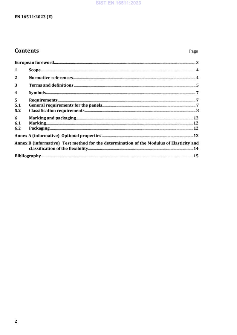 In Annex A (informative), optional properties are given. In Annex B (informative), a test method for the classification of the flexibility is given.