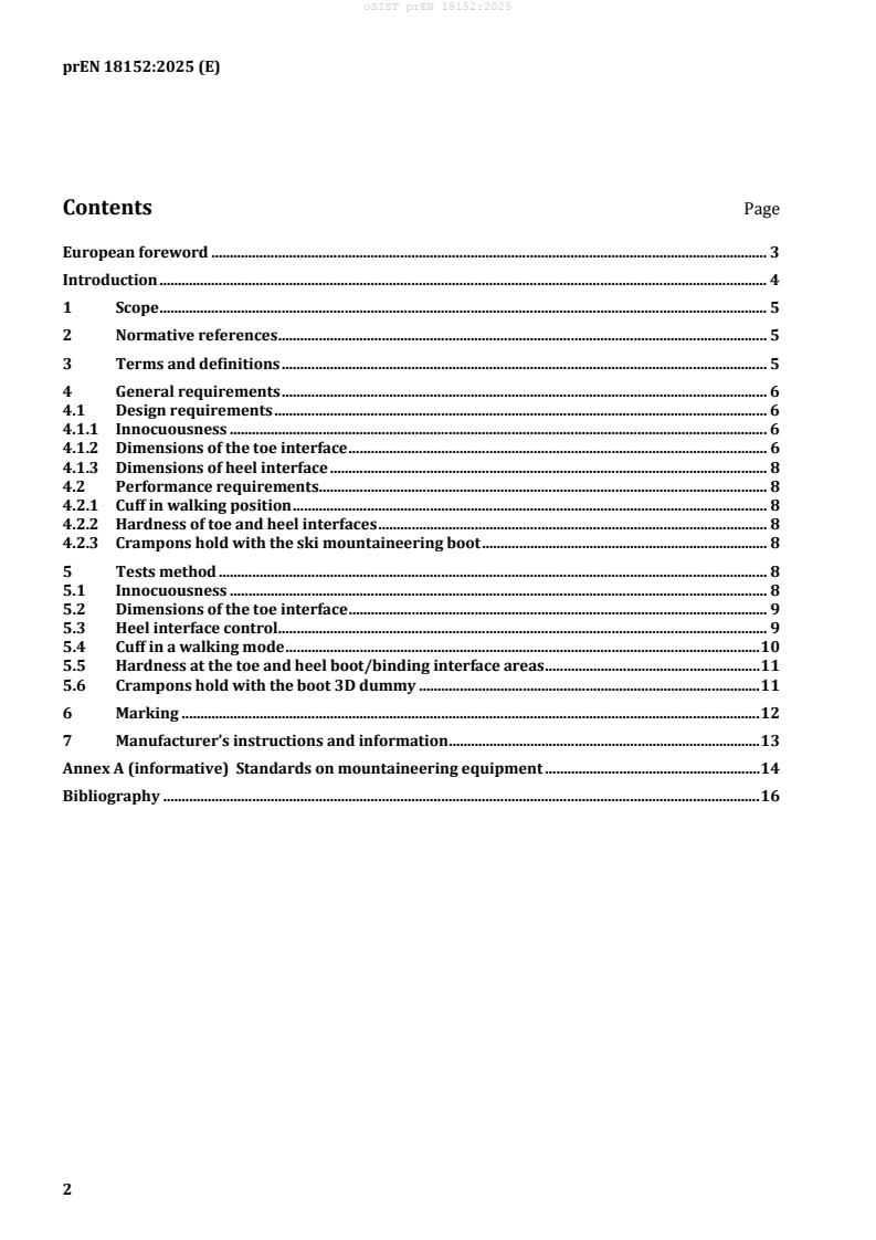 The European standard oSIST prEN 18152:2025:2025 defines the interfaces between ski mountaineering boots and clip-on binding crampons, setting out indispensable requirements and test methods to ensure compatibility, safety, and performance. Developed by CEN Technical Committee CEN/TC 136 and based on prior standards including ISMF 104:2018, this updated draft standard addresses the dimensions, characteristics, and mechanical features essential for reliable attachment between mountaineering boots and clip-on crampons. The standard enables manufacturers and users to verify the interface design, ensuring secure fit and functionality.