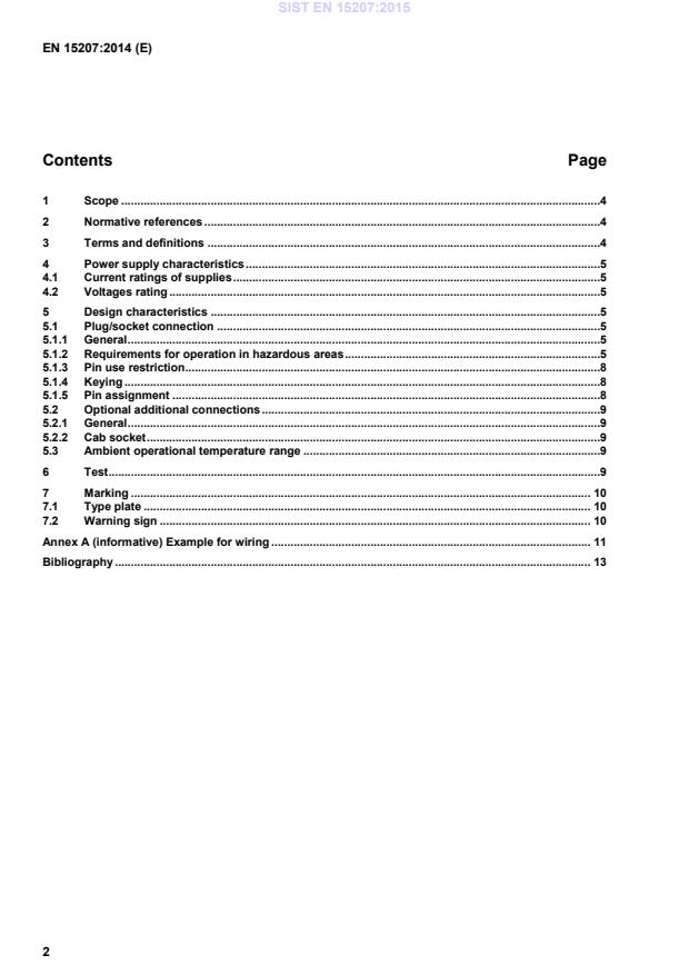 SIST EN 15207:2015 is a standard published by the Slovenian Institute for Standardization (SIST). Its full title is "Tanks for the transport of dangerous goods - Plug/socket connection and supply characteristics for service equipment in hazardous areas with 24 V nominal supply voltage". This standard covers: This European Standard specifies the interoperability requirements for the tractor/trailer and/or transport tank/trailer plug/socket for the use in hazardous areas, being: - the connection used for the supply Type A and supply Type S electrical power to service equipment; and - the supply characteristics for each operating mode. This plug/socket combination includes provisions for future connections including data transfer. The plug/socket connection is not used for purposes which are specified in other standards for truck - trailer connections e.g. ISO 12098 and ISO 7638-1.