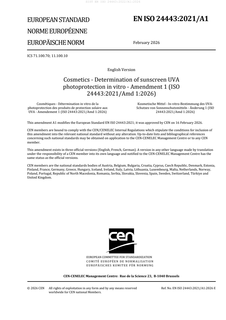 This amendment A1 modifies the European Standard EN ISO 24443:2021; it was approved by CEN on 16 February 2026.