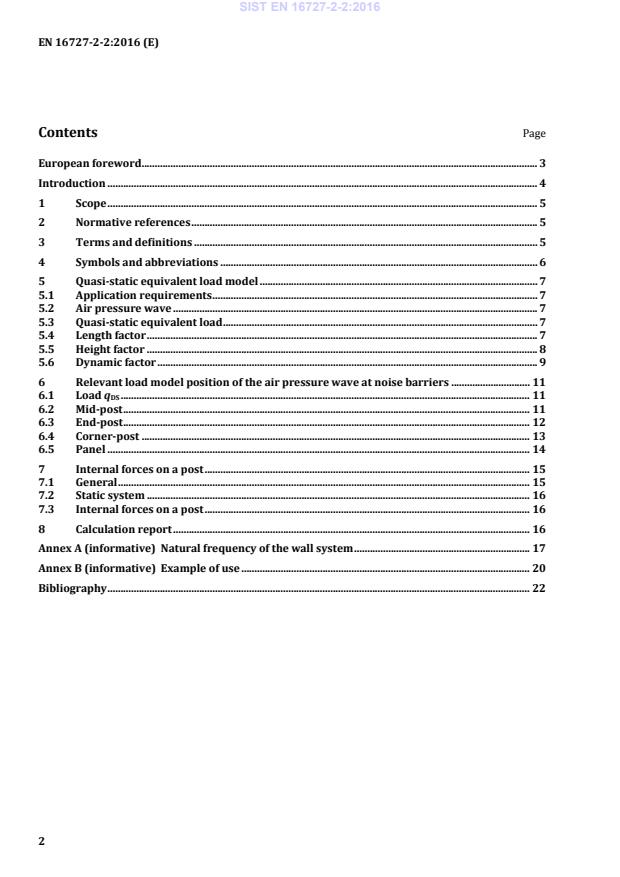 SIST EN 16727-2-2:2016 is a standard published by the Slovenian Institute for Standardization (SIST). Its full title is "Railway applications - Track - Noise barriers and related devices acting on airborne sound propagation - Non-acoustic performance - Part 2-2: Mechanical performance under dynamic loadings caused by passing trains - Calculation method". This standard covers: This European standard defines the loading, the relevant load model positions and the internal forces acting on noise barriers, due to the air pressure wave set out in EN 1991 2:2003, 6.6.2. The vertical and horizontal shapes of the air pressure wave and the dynamic effects have been taken into account. The calculation method described in this European standard has been developed for noise barriers having a post-and-panel structure with piled foundations. It can also be used where cladding is attached to a rigid structure. For structures with piled foundations, an empirical formula for determination of the natural frequency is given in Annex A. Annex B contains an example of application of the calculation method for determination of internal forces and moments acting on a mid-post. The design of noise barriers (e.g. to fatigue resistance) is not part of this standard.