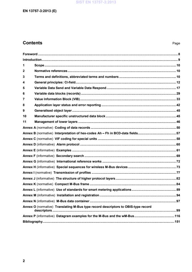 Tables Table 1 — CI-field codes used by the master or the slave . 12 Table 2 — Coding of the upper 4 bits of the first parameter after CI = 50h or 53h . 15 Table 3 — Variable data structure in answer send and respond direction . 17 Table 4 — Short data header . 18 Table 5 — Long data header . 18 Table 6 — Device type identification . 19 Table 7 — Coding of the status field . 22 Table 8 — Application errors coded with the status-field . 22 Table 9 — Meaning of status byte for partner messages . 23 Table 10 — General definition of the configuration field . 23 Table 11 — Definition of the mode bits (encryption method) . 24 Table 12 — Definition of the configuration field for encryption modes 2 and 3. 25 Table 13 — Definition of the configuration field for encryption mode 5 . 26 Table 14 — Initialisation vector mode 5 for the CBC-AES-128 . 26 Table 15 — Contents of meter message . 27 Table 16 — Contents of partner message . 28 Table 17 — Accessibility of a meter . 28 Table 18 — Address structure of the wireless link layer . 29 Table 19 — Structure of a data record (transmitted from left to right). 29 Table 20 — Coding of the Data Information Field (DIF) . 30 Table 21 — Coding of the data field . 30 Table 22 — DIF-coding for special functions . 31 Table 23 — Function field. 31 Table 24 — Coding of the Data Information Field Extension (DIFE) . 32 Table 25 — Coding of the Value Information Field (VIF) . 33 SIST EN 13757-3:2013