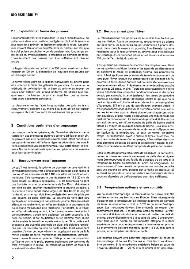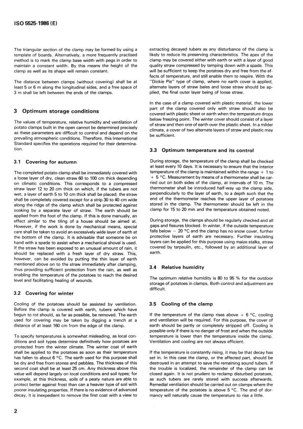 Keywords: ISO 5525:1986, potato storage, clamp storage, open-air storage, prism storage, temperature control, ventilation, potato handling, storage humidity.