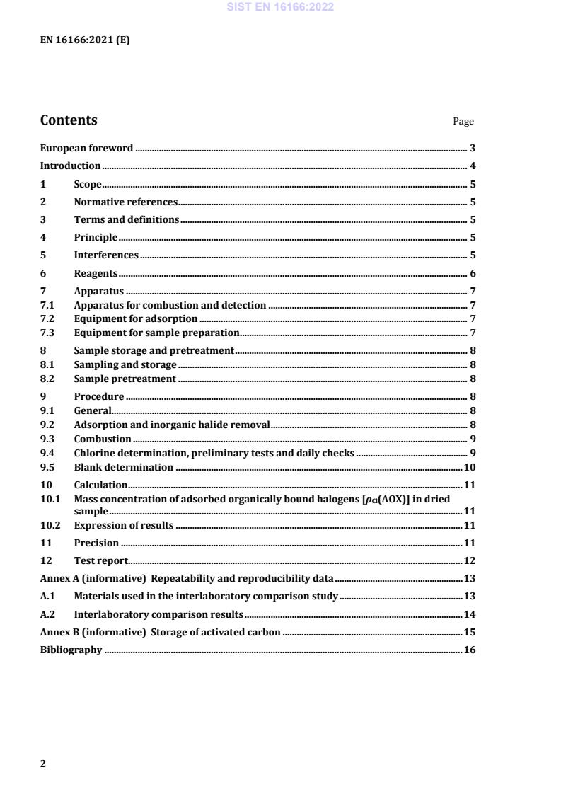Ta evropski standard opisuje empirično metodo za neposredno določevanje organsko vezanega klora, broma in joda (ne pa fluora), adsorbiranih in vezanih v matrico vzorca. V določevanje so vključeni nehlapni organsko vezani halogeni, sposobni adsorbcije na aktiviran ogljik v vodni fazi vzorca pred sušenjem ali adsorbirani na površino vzorca.
