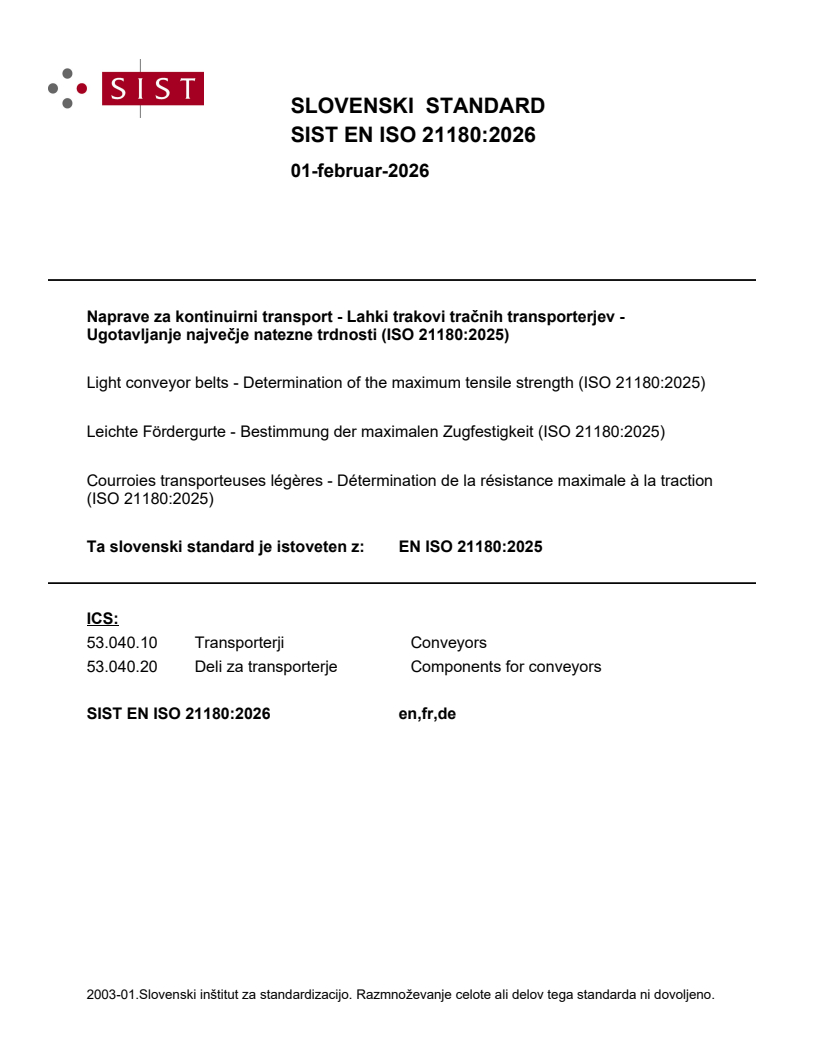 SIST EN ISO 21180:2026 is a standard published by the Slovenian Institute for Standardization (SIST). Its full title is "Light conveyor belts - Determination of the maximum tensile strength (ISO 21180:2025)". This standard covers: This document specifies a test method for the determination of the maximum tensile strength of light conveyor belts, according to ISO 21183-1, or of other conveyor belts where ISO 283 is not applicable.