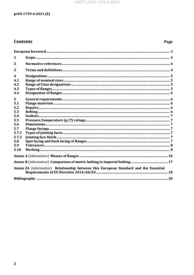prEN 1759-4 is the CEN draft for Class designated circular flanges made from aluminium alloy, covering nominal sizes DN 15 to DN 600 (NPS 1/2 to NPS 24) and pressure Classes 150 to 300. The standard specifies flange types, dimensions, facings, tolerances, bolt sizes, surface finish of jointing faces, marking, materials and associated pressure/temperature (p/T) ratings for use in piping and pressure-vessel applications.