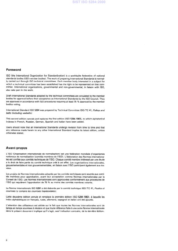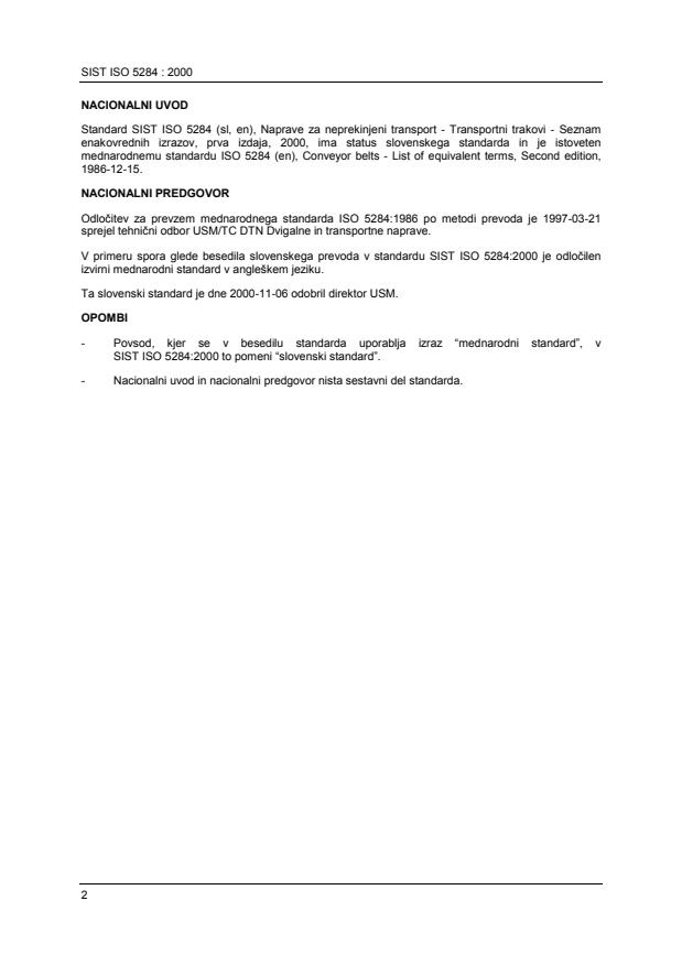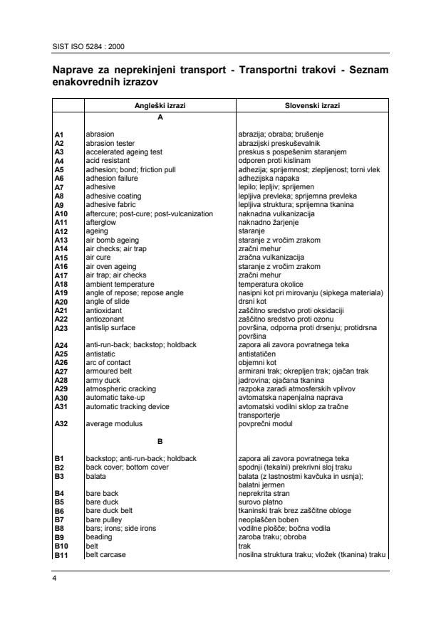 SIST ISO 5284:2000 is a standard published by the Slovenian Institute for Standardization (SIST). Its full title is "Conveyor belts -- List of equivalent terms". This standard covers: This second edition cancels and replaces the first edition (1983). Contains terms in English (in American, if different), French, German, Italian, Spanish, and Russian. The terms are listed in the alphabetical order of the english language. Alphabetical indexes for each language mentioned are also included.
