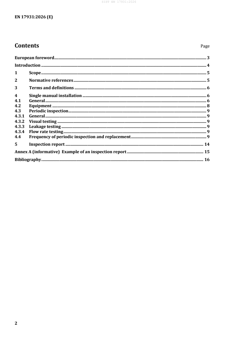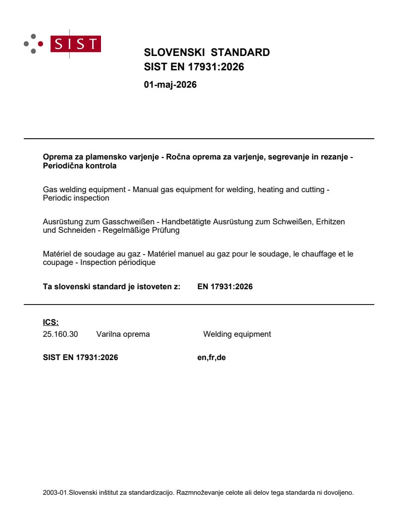 SIST EN 17931:2026 is a standard published by the Slovenian Institute for Standardization (SIST). Its full title is "Gas welding equipment - Manual gas equipment for welding, heating and cutting - Periodic inspection". This standard covers: This document specifies guidelines for periodic inspections of gas equipment for welding, cutting and allied processes placed downstream of the gas cylinder’s valve as shown in Figure 1 or, in the case of centralized distribution, downstream from the tapping point, since commissioning. NOTE In some cases, gas cylinders can be replaced by cylinder bundles. Acetylene cylinder bundle systems upstream of the tapping point are excluded. This document applies to gas welding equipment intended for professional use which utilizes compressed gases up to 300 bar (30 MPa), acetylene, liquefied petroleum gas (LPG), methylacetylene-propadiene mixtures (MPS) and carbon dioxide (CO2) and related mixtures. This document does not apply to automatic applications of gas welding, cutting and allied processes.