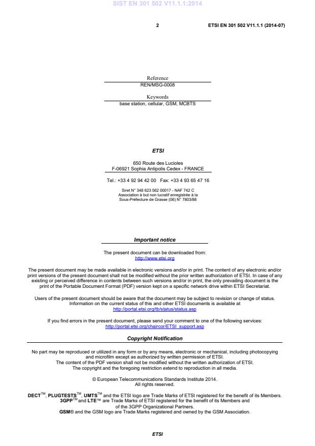DECTTM, PLUGTESTSTM, UMTSTM and the ETSI logo are Trade Marks of ETSI registered for the benefit of its Members. 3GPPTM and LTE™ are Trade Marks of ETSI registered for the benefit of its Members and of the 3GPP Organizational Partners. GSM® and the GSM logo are Trade Marks registered and owned by the GSM Association. SIST EN 301 502 V11.1.1:2014