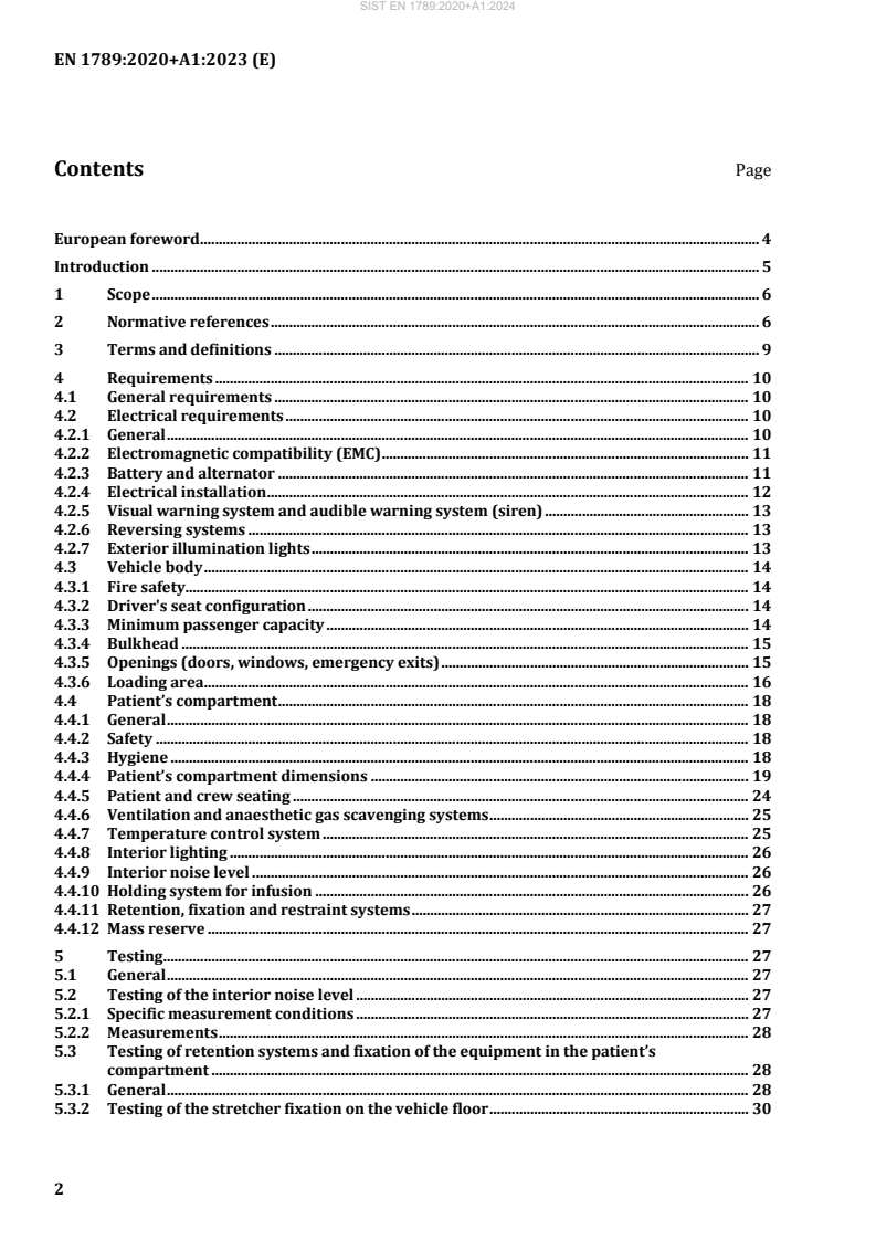 SIST EN 1789:2020+A1:2024 is a standard published by the Slovenian Institute for Standardization (SIST). Its full title is "Medical vehicles and their equipment - Road ambulances". This standard covers: This European Standard specifies requirements for the design, testing, performance and equipping of road ambulances used for the transport, monitoring, treatment and care of patients. It contains requirements for the patient’s compartment in terms of the working environment, ergonomic design and the safety of the crew and patients.This European Standard does not cover the training of the staff which is the responsibility of the authority/authorities in the country where the ambulance is to be registered. This European Standard is applicable to road ambulances capable of transporting at least one person on a stretcher and excludes the transportation of hospital beds. This standard also specifies requirements for ambulances intended to carry transport incubator systems. The European Standard covers the specific requirements of each type of road ambulance which are designated according to the patient condition e.g. patient transport road ambulance types A1, A2, B and C. This European Standard gives general requirements for medical devices carried in road ambulances and used therein and outside hospitals and clinics in situations where the ambient conditions can differ from normal indoor conditions.