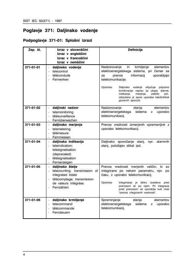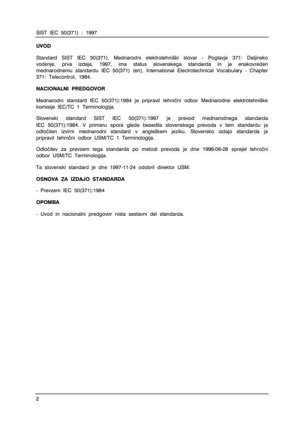 SIST IEC 60050-371:1997 is a standard published by the Slovenian Institute for Standardization (SIST). Its full title is "International Electrotechnical Vocabulary. Chapter 371: Telecontrol". This standard covers: Terms on telecontrol, teleprotection and associated telecommunications for electric power systems. It has the status of a horizontal standard in accordance with IEC Guide 108.