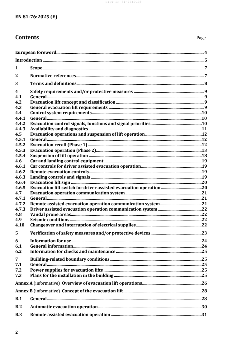 EN 81-76:2025 - published by CEN - specifies additional safety requirements to EN 81-20:2020 for new passenger and goods-passenger lifts intended to support faster evacuation of persons with disabilities, including in response to a fire alarm. It defines optional evacuation modes (automatic, remote-assisted, driver-assisted), two equipment classes (Class A and Class B), and building-related information needed for safe evacuation lift deployment. This standard supersedes CEN/TS 81-76:2011 and is intended for new installations only (not applicable to lifts manufactured before its publication).