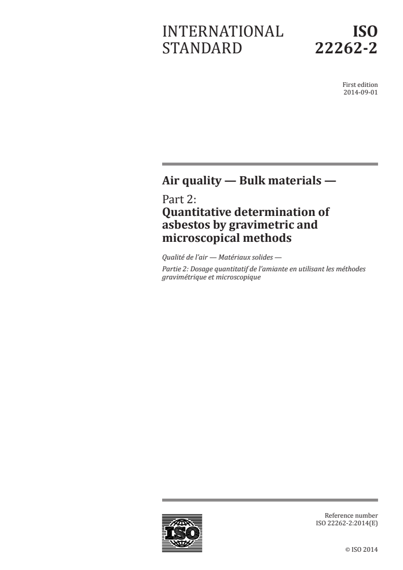 Keywords: ISO 22262-2, asbestos quantification, gravimetric matrix reduction, microscopic methods, vermiculite, talc, asbestos mass fraction, bulk materials, air quality, asbestos testing.