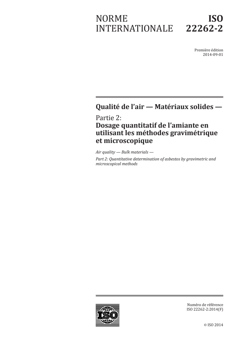 ISO 22262-2:2014 - Qualité de l'air — Matériaux solides — Partie 2: Dosage quantitatif de l'amiante en utilisant les méthodes gravimétrique et microscopique/28/2014