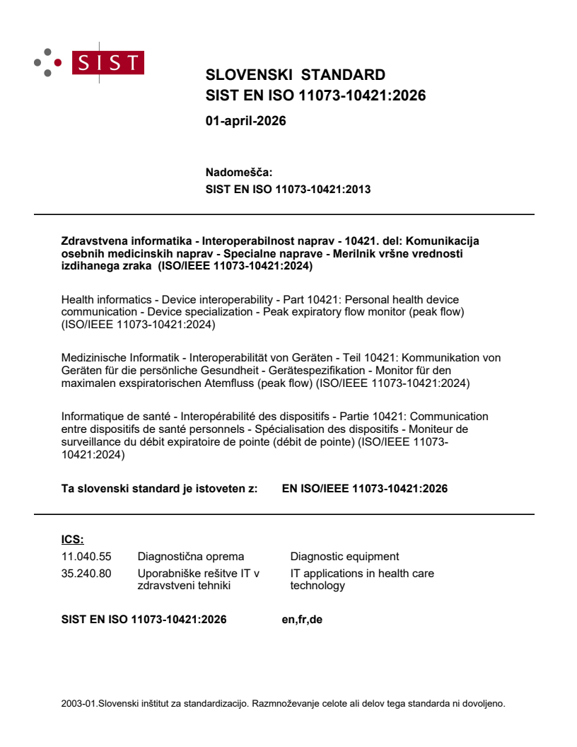 SIST EN ISO 11073-10421:2026 is a standard published by the Slovenian Institute for Standardization (SIST). Its full title is "Health informatics - Device interoperability - Part 10421: Personal health device communication - Device specialization - Peak expiratory flow monitor (peak flow) (ISO/IEEE 11073-10421:2024)". This standard covers: This document establishes a normative definition of communication between personal telehealth peak flow monitoring devices (agents) and managers (e.g., cell phones, personal computers, personal health appliances, and set top boxes) in a manner that enables plug-and-play interoperability. It leverages work done in other ISO/IEEE 11073 standards including existing terminology, information profiles, application profile standards. It specifies the use of specific term codes, formats, and behaviors in telehealth environments restricting optionality in base frameworks in favor of interoperability. This document defines a common core of functionality of a peak-flow monitoring device. The use case is restricted to personal respiratory monitoring and therefore does not include hospital-based spirometry. Continuous and high-acuity monitoring (e.g., for emergency response) are outside the scope of the use case. In the context of personal health devices, a peak flow meter is a device is used to measure the respiratory function of those managing respiratory conditions such as asthma and chronic obstructive pulmonary disease. The ability to identify declining respiratory status prior to the need for acute intervention improves the quality of life for the individual while reducing the overall costs of care. Respiratory status data are collected by a personal respiratory monitoring device and forwarded to a central data repository for review and action by a health care provider. The data are episodic in nature and are forwarded at designated intervals or when the person is symptomatic.