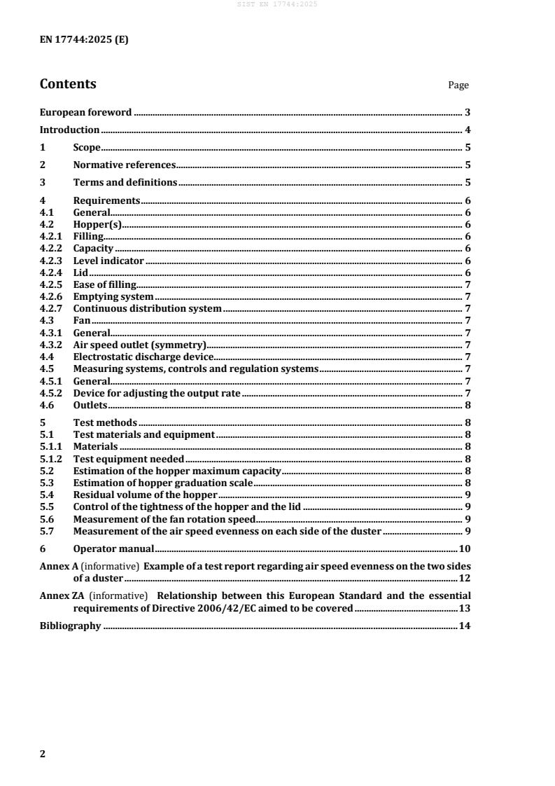 EN 17744:2025 is a CEN European Standard for agricultural and forestry machinery - environmental requirements for dusters. It specifies general design requirements and associated test methods for mechanical dusters that apply formulated products in dust form, with the objective of minimizing environmental contamination during use. Hand‑operated portable (knapsack) dusters are excluded. The standard is intended to support compliance with the Machinery Directive and complements existing standards such as EN ISO 4254‑1 (operator safety) and ISO crop protection vocabulary.