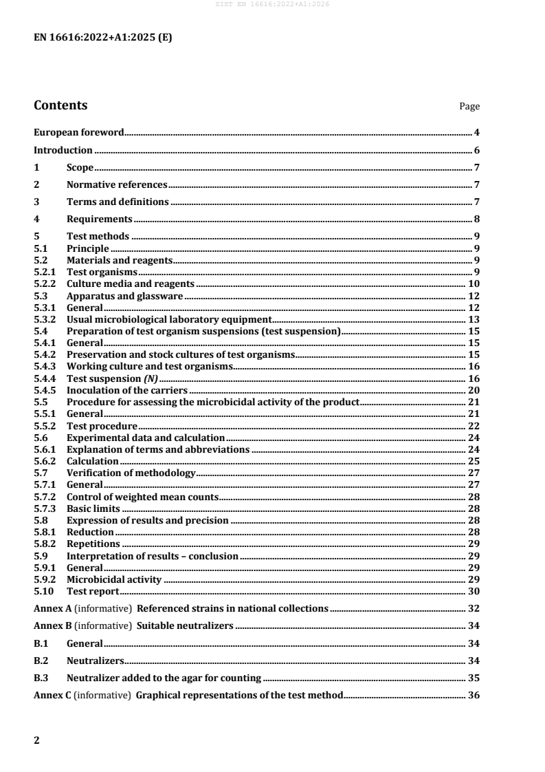 - Data handling and acceptance criteria: Provides calculation methods, weighted mean counts, verification/precision requirements, and rules for interpreting microbicidal activity. Test report content is defined (Annex F example).