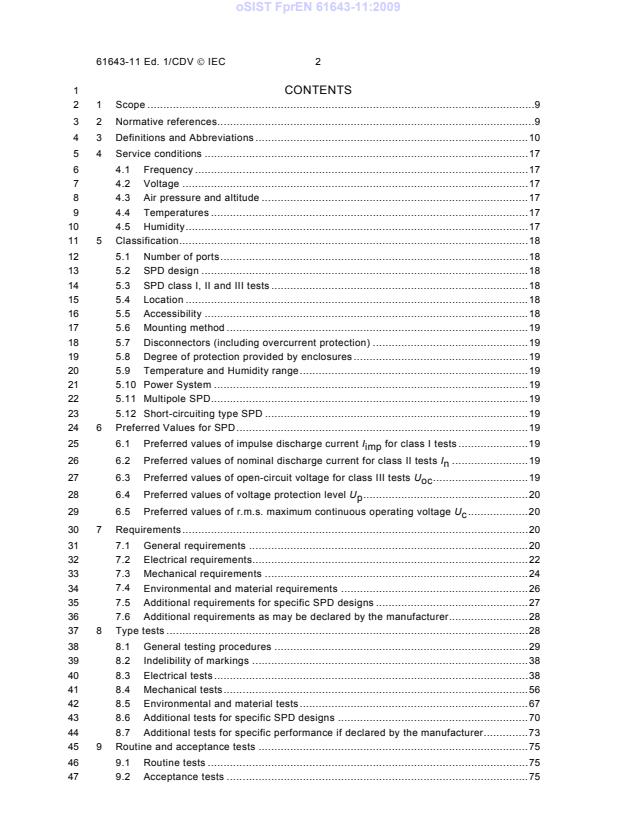 2CONTENTS 1 1 Scope.9 2 2 Normative references.9 3 3 Definitions and Abbreviations.10 4 4 Service conditions.17 5 4.1 Frequency.17 6 4.2 Voltage.17 7 4.3 Air pressure and altitude.17 8 4.4 Temperatures.17 9 4.5 Humidity.17 10 5 Classification.18 11 5.1 Number of ports.18 12 5.2 SPD design.18 13 5.3 SPD class I, II and III tests.18 14 5.4 Location.18 15 5.5 Accessibility.18 16 5.6 Mounting method.19 17 5.7 Disconnectors (including overcurrent protection).19 18 5.8 Degree of protection provided by enclosures.19 19 5.9 Temperature and Humidity range.19 20 5.10 Power System.19 21 5.11 Multipole SPD.19 22 5.12 Short-circuiting type SPD.19 23 6 Preferred Values for SPD.19 24 6.1 Preferred values of impulse discharge current Iimp for class I tests.19 25 6.2 Preferred values of nominal discharge current for class II tests In.19 26 6.3 Preferred values of open-circuit voltage for class III tests Uoc.19 27 6.4 Preferred values of voltage protection level Up.20 28 6.5 Preferred values of r.m.s. maximum continuous operating voltage Uc.20 29 7 Requirements.20 30 7.1 General requirements.20 31 7.2 Electrical requirements.22 32 7.3 Mechanical requirements.24 33 7.4 Environmental and material requirements.26 34 7.5 Additional requirements for specific SPD designs.27 35 7.6 Additional requirements as may be declared by the manufacturer.28 36 8 Type tests.28 37 8.1 General testing procedures.29 38 8.2 Indelibility of markings.38 39 8.3 Electrical tests.38 40 8.4 Mechanical tests.56 41 8.5 Environmental and material tests.67 42 8.6 Additional tests for specific SPD designs.70 43 8.7 Additional tests for specific performance if declared by the manufacturer.73 44 9 Routine and acceptance tests.75 45 9.1 Routine tests.75 46 9.2 Acceptance tests.75 47 oSIST FprEN 61643-11:2009