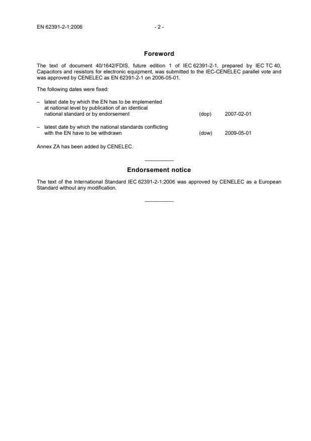 Foreword The text of document 40/1642/FDIS, future edition 1 of IEC 62391-2-1, prepared by IEC TC 40, Capacitors and resistors for electronic equipment, was submitted to the IEC-CENELEC parallel vote and was approved by CENELEC as EN 62391-2-1 on 2006-05-01. The following dates were fixed: – latest date by which the EN has to be implemented