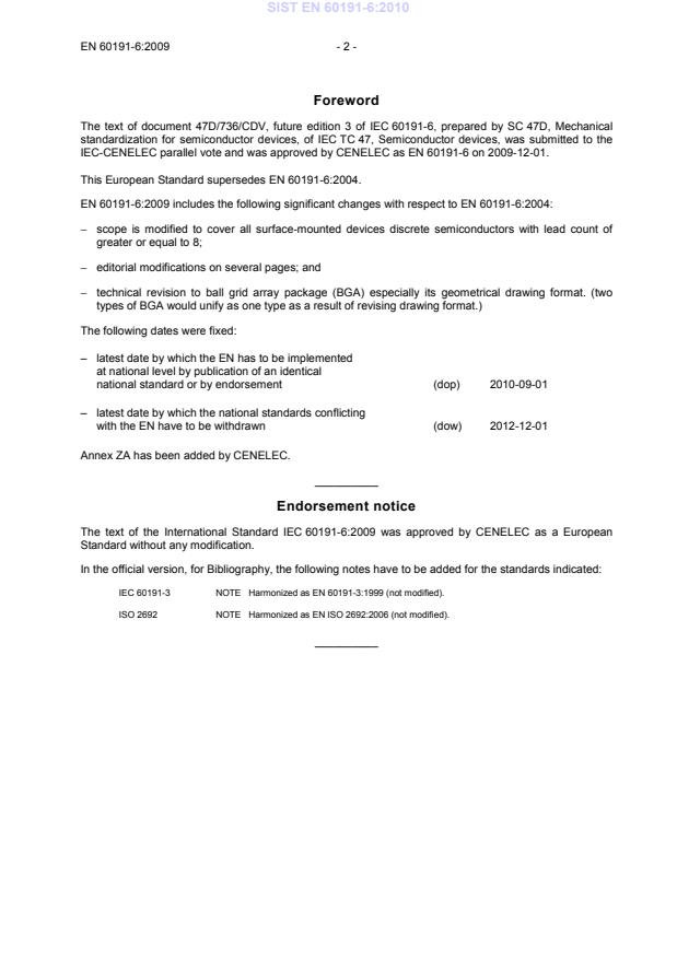 SIST EN 60191-6:2010 is a standard published by the Slovenian Institute for Standardization (SIST). Its full title is "Mechanical standardization of semiconductor devices -- Part 6: General rules for the preparation of outline drawings of surface mounted semiconductor device packages (IEC 60191-6:2009)". This standard covers: IEC 60191-6:2009 gives general rules for the preparation of outline drawings of surface-mounted semiconductor devices. It supplements IEC 60191-1 and IEC 60191-3. It covers all surface-mounted devices discrete semiconductors with lead count of greater or equal to 8, as well as integrated circuits classified as form E in Clause 3 of IEC 60191-4. This third edition of IEC 60191-6 cancels and replaces the second edition, published in 2004 and constitutes a technical revision. This edition includes the following significant changes with respect to the previous edition: a) scope is modified to cover all surface-mounted devices discrete semiconductors with lead count of greater or equal to 8; b) editorial modifications on several pages; and c) technical revision to ball grid array package (BGA) especially its geometrical drawing format. (two types of BGA would unify as one type as a result of revising drawing format.