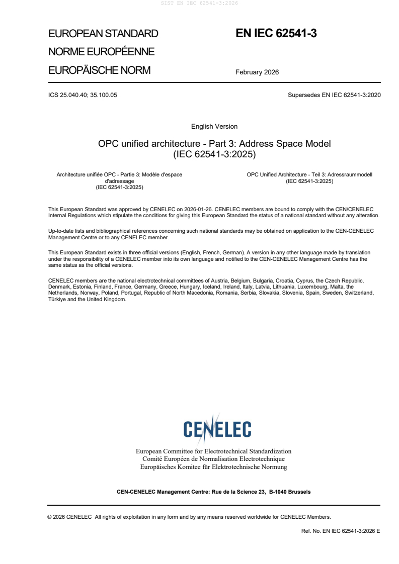 The oSIST prEN IEC 62541-3:2024 standard, developed by CLC, is the fourth edition of the OPC Unified Architecture (OPC UA) Part 3 specification, titled "Address Space Model." This document defines the OPC UA AddressSpace and its core Objects, providing the foundational meta model upon which OPC UA information models are built. As a technical revision of the 2020 third edition, this updated standard introduces key enhancements to improve interoperability, security, and information modelling for industrial automation and IT applications.