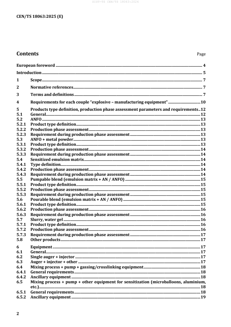 SIST-TS CEN/TS 18063:2026 is a technical specification published by the Slovenian Institute for Standardization (SIST). Its full title is "Explosives for civil uses - Assessment of on-site mixed explosives and associated manufacturing units". This standard covers: This document gives guidance on the issues related to the conformity assessment of explosives manufactured on-site. On one hand, it specifies requirements to be considered for the assessment during the design phase of the explosive and a simple and robust approach to follow for the assessment of the conformity in the production phase. And on the other hand, it specifies requirements for the mobile manufacturing units and their accessories as a contribution to the guarantee of the conformity of explosives produced in on-site conditions with no access to a laboratory. This document gives guidance on also basic requirements for explosives loading equipment. This document does not apply to the preparation of multi-component explosives as they neither require manufacturing equipment nor mechanical loading. NOTE 1 This document does not address the requirements of the transport of dangerous goods regulations. NOTE 2 This document does not address the requirements established in Directive 2006/42/EC (Machinery). NOTE 3 Despite the provisions given in this document, other provisions provided for in state, federal or local regulations apply. NOTE 4 The intention of this document is not to hinder the development and use of new technologies (including equipment and processes) for the on-site manufacture of explosive, but because of limited access to testing resources on site, the approach consisting of having specified requirements for the equipment is valid to ensure the conformity of future products and technologies.