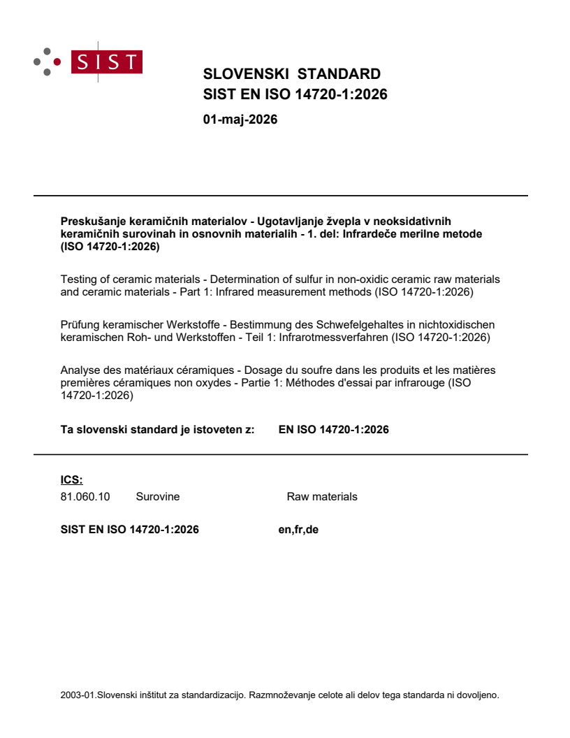 Preskušanje keramičnih materialov - Ugotavljanje žvepla v neoksidativnih keramičnih surovinah in osnovnih materialih - 1. del: Infrardeče merilne metode (ISO 14720-1:2026)