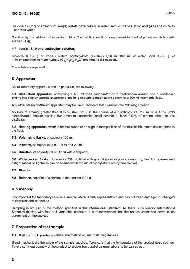 Keywords: ISO 2448, ethanol content, fruit and vegetable products, chemical analysis, ethanol determination, potassium dichromate titration, food quality control, ethanol measurement in food, fruit juice testing, ethanol in jams and purees, agricultural product standards.